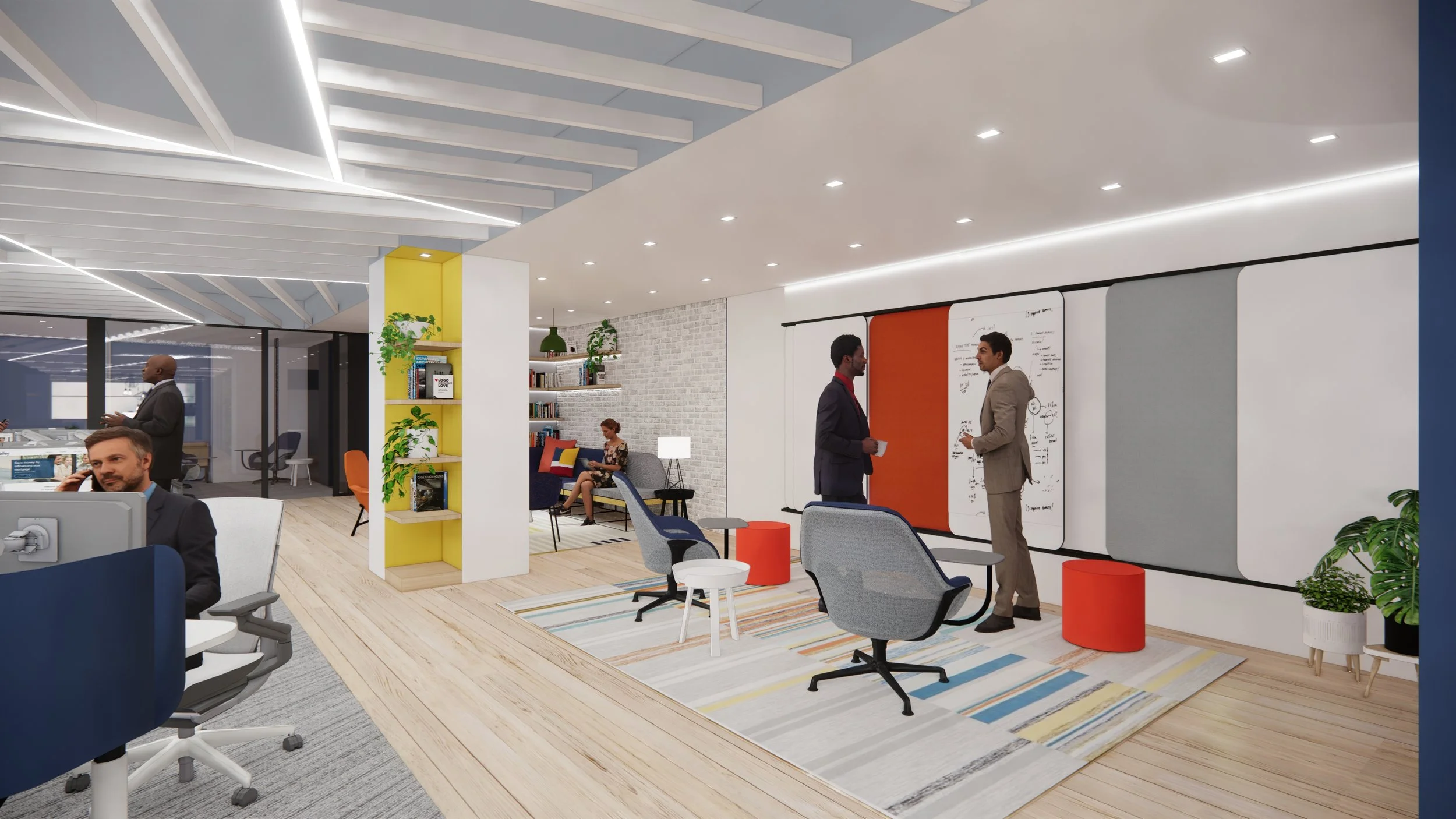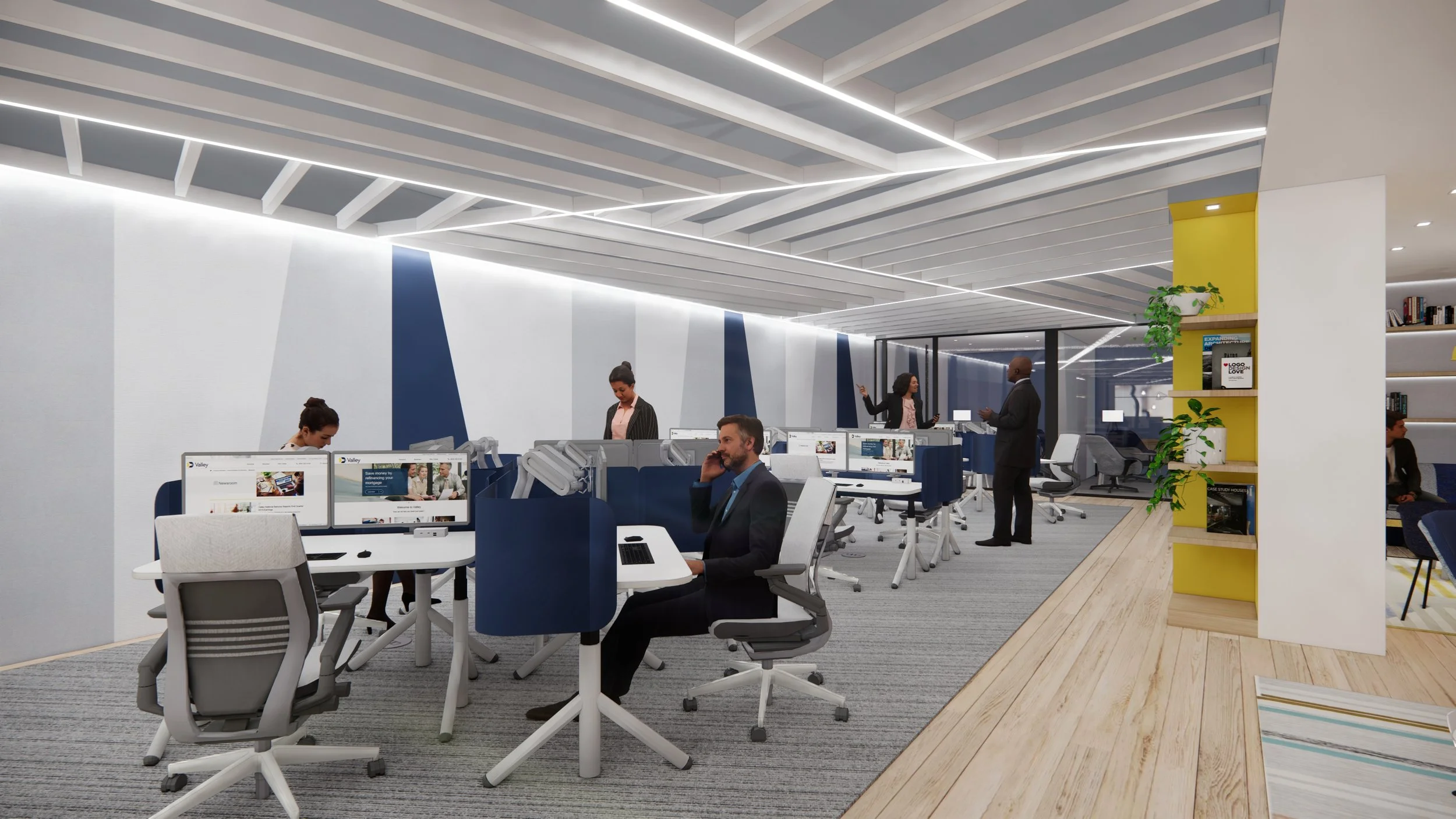 Headquartered in New Jersey, Valley Bank sought to establish a modest coworking presence in New York City. At one of its New York retail locations, a dedicated floor was integrated to serve as a workplace, providing meeting and collaboration spaces for employees. The newly standardized retail features of Valley Bank were seamlessly incorporated into this facility to reinforce the company's design aesthetic. This compact coworking space offers a variety of space types, seamlessly blending larger multi-use areas with small and intimate collaboration zones and focused workspaces. The centrally placed cafe area enhances the space with a welcoming and hospitable atmosphere.