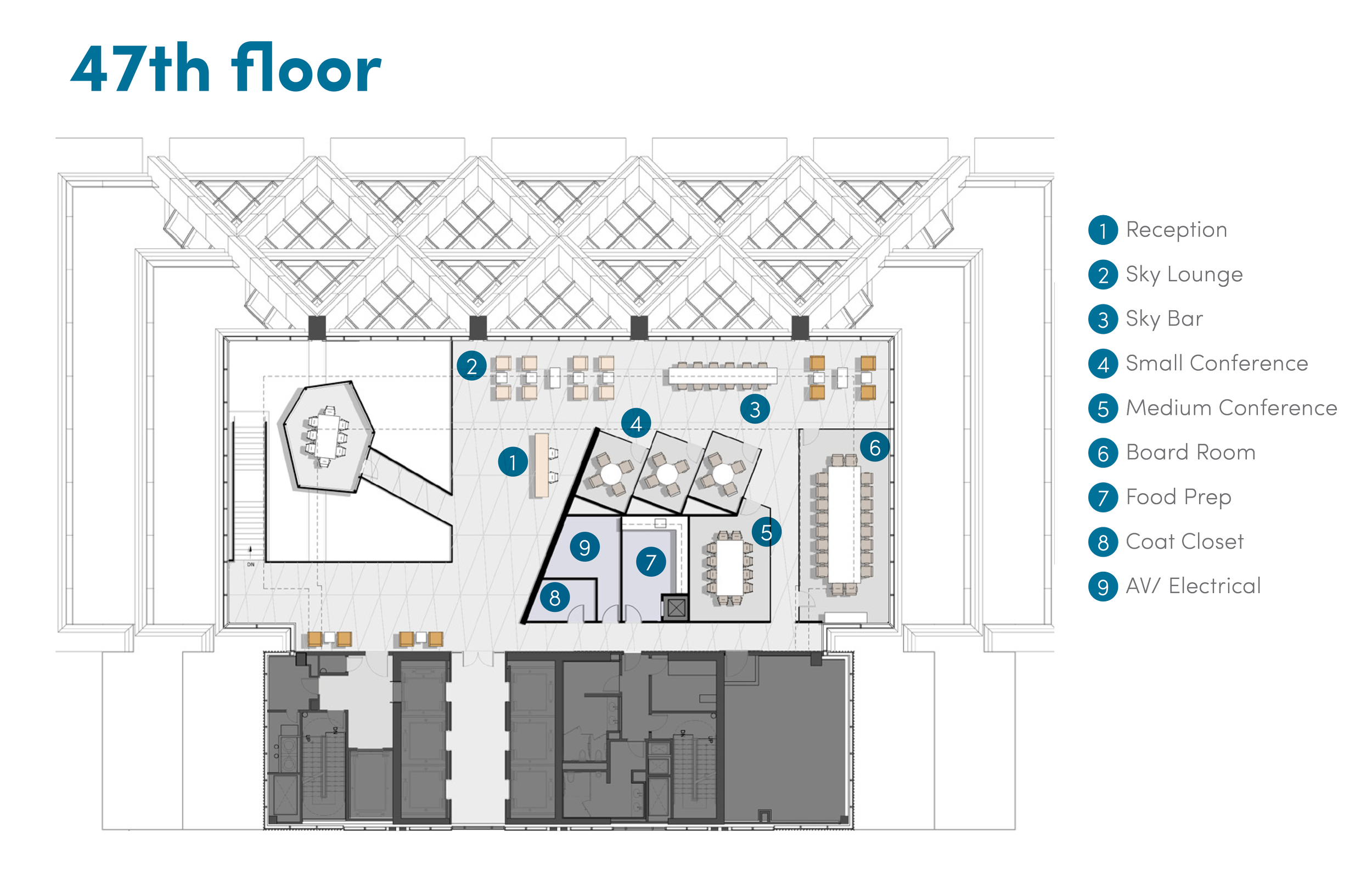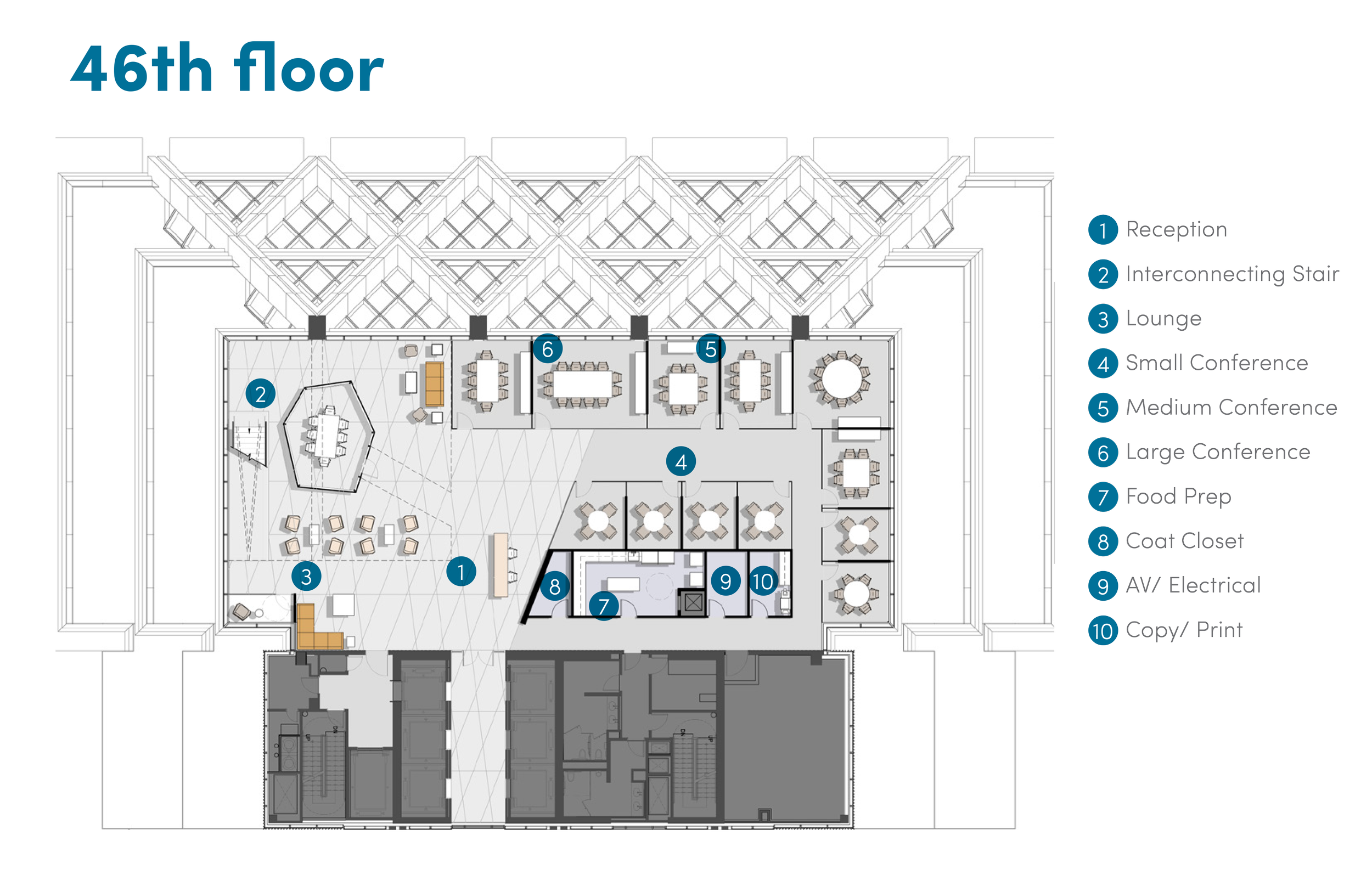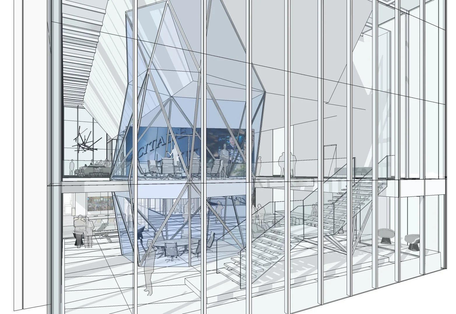 Citadel's new space at 425 Park Ave serves as a catalyst for innovation, supporting the future of the workspace and accelerating the transformation of workplaces into the most engaging environments for people to work, learn, collaborate, and generate ideas. The two-story conferencing center, positioned at the crown of the building, is designed to attract talent and captivate visitors. The floating executive conference is supported by the geometrical glass structure, anchoring to the building's bulkhead. A sculptural stair connects the two floors at the perimeter of the building, allowing participants to appreciate the view of Park Ave.