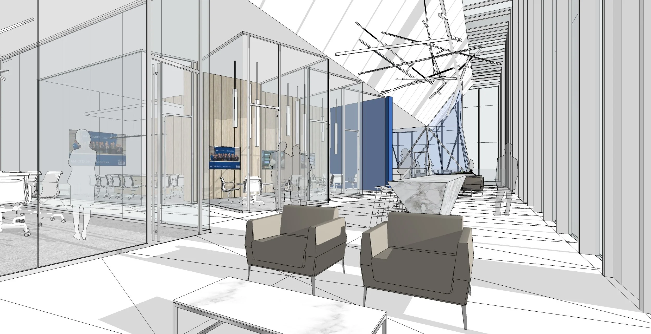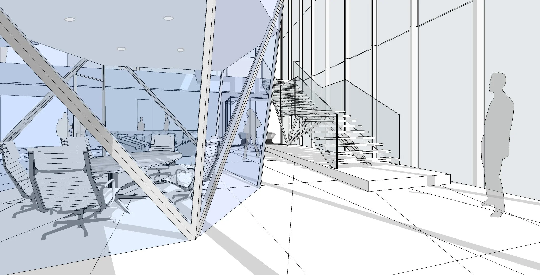 Expressive double height glass meeting structure serves as an anchor and key feature for the conferencing center.